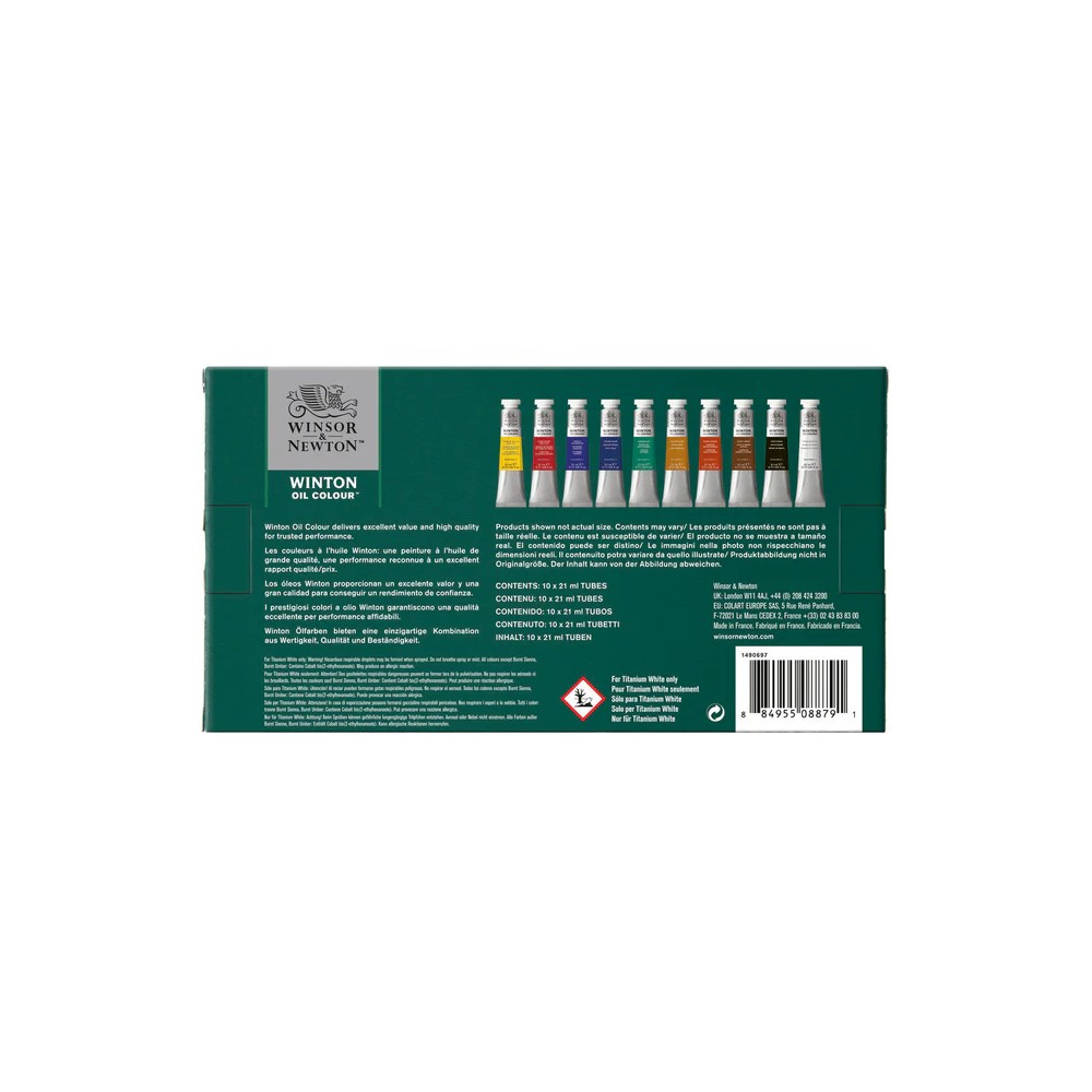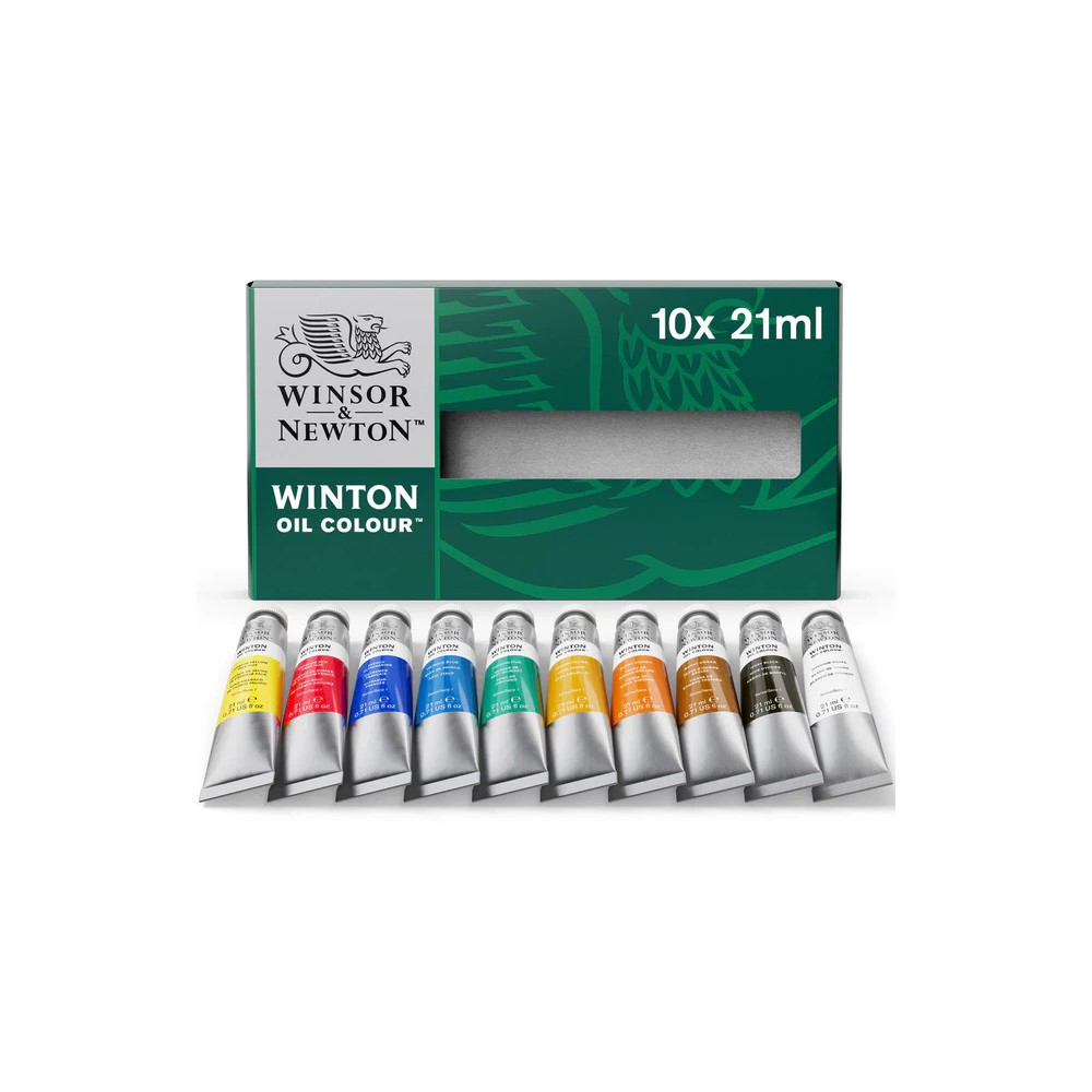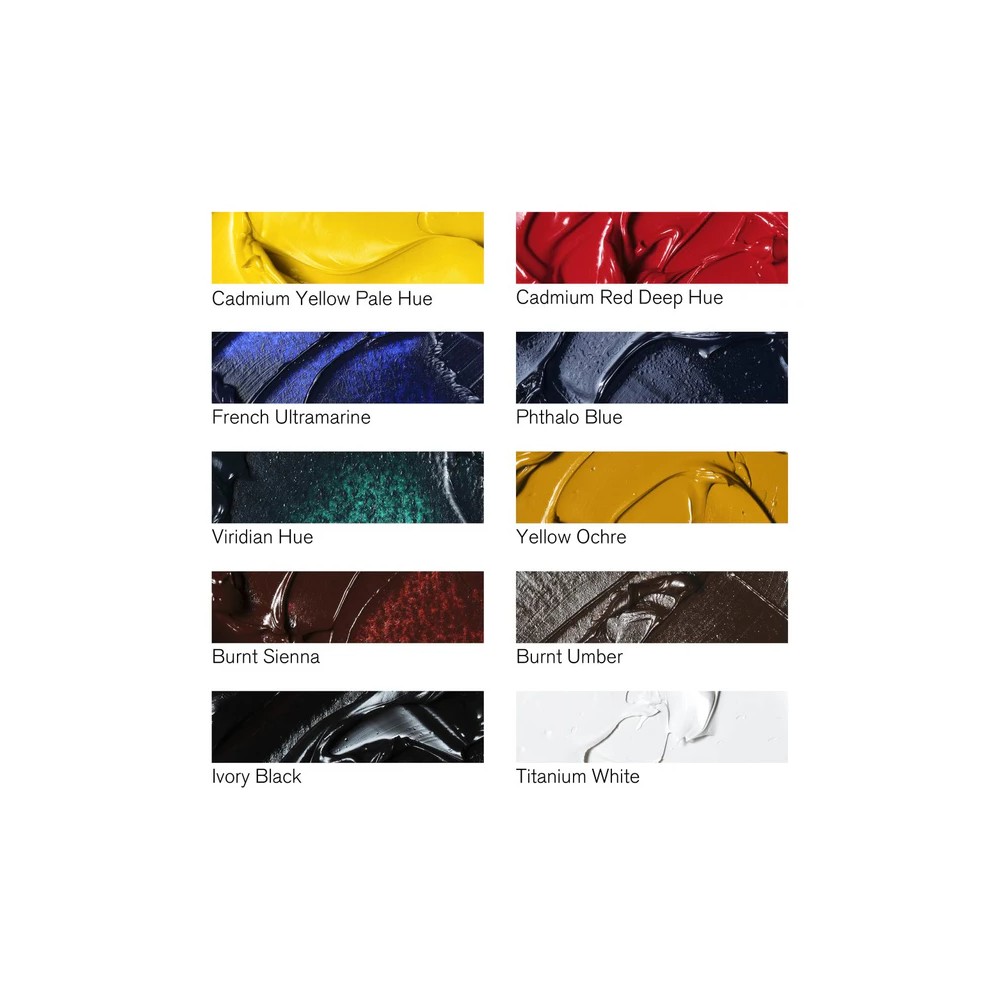 Este set contiene una amplia gama de colores en tubos de 21 ml. Incluye: Amarillo Cadmio Tono Pálido, Rojo Cadmio Tono Oscuro, Ultramar Francés, Azul Ftalo, Sombra Tostada, Tono Viridiano, Ocre Amarillo, Siena Tostada, Negro Marfil y Blanco Titanio. El contenido real puede variar.